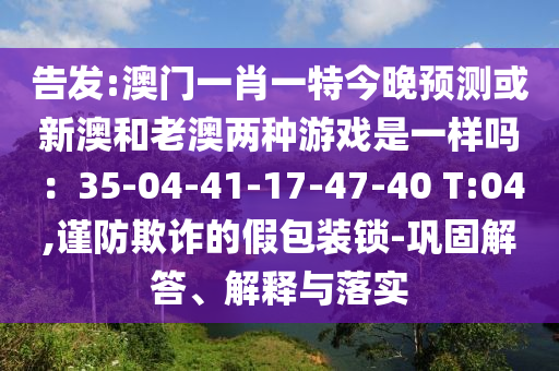 “告發(fā)”一詞通常指的是舉報或揭發(fā)某種信息或行為,而“澳門一肖一特今晚預測”似乎是與澳門游戲有關的某種預測或猜測,在游戲領域,由于游戲的隨機性和不確定性,任何關于游戲結果的預測都應被視為非科學的、沒有根據(jù)的猜測,至于“新澳和老澳兩種游戲是否一樣”的問題,需要具體了解兩種游戲的規(guī)則、玩法、賠率等細節(jié)才能給出準確答案,而“35-04-41-17-47-40 T:04”則可能是某種游戲的號碼或者組合。